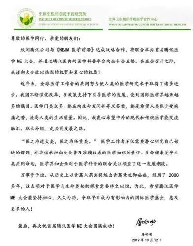 “医学门类众多,都在向生命发问并寻求答案, 都是希望人类能少受病痛之苦,提高人类的生活质量。”屠呦呦在向首届腾讯医学ME大会发出的贺信中,这样表示。