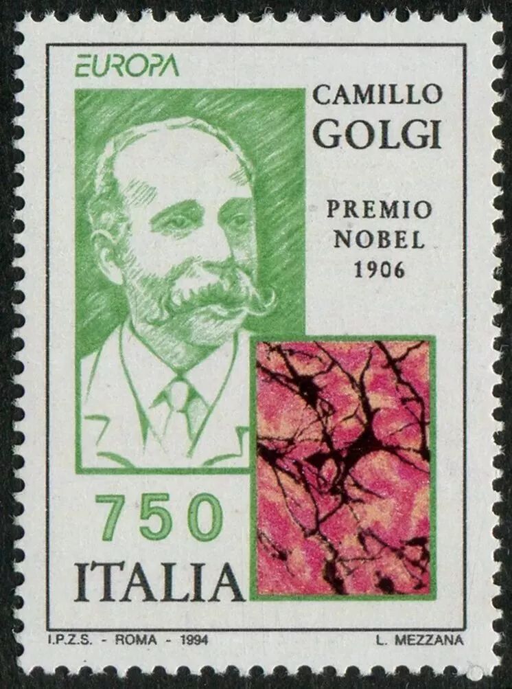 意大利(1994):1906年诺贝尔生理学或医学奖获得者高尔基,高尔基像和神经网络理论示意图